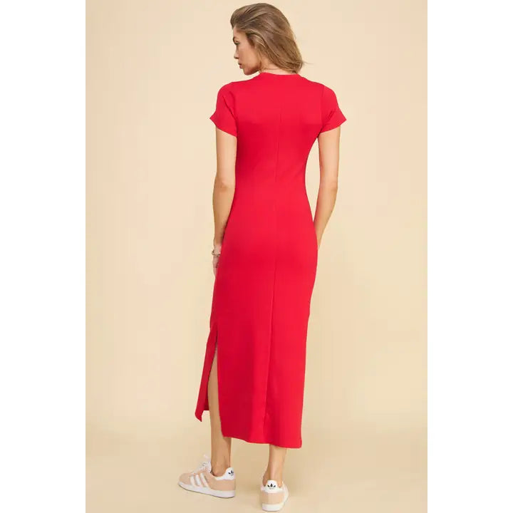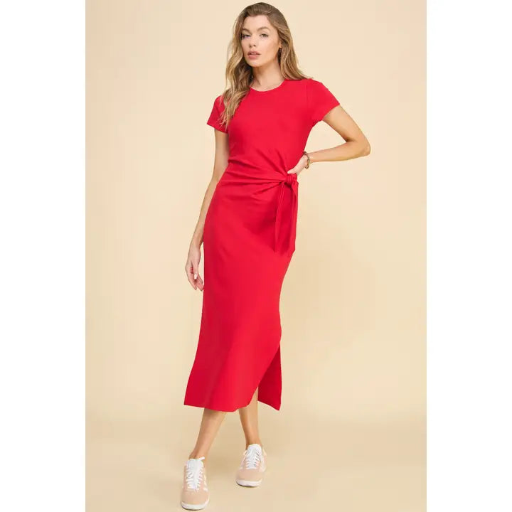 Introducing the Anna Red Dress! Made in the USA with stretch material, this midi dress features a unique tie on the front side and short sleeves. Perfect for any occasion, this dress will add a touch of flair to your wardrobe. Our model is wearing a size S (Standout, stylish, stunning).