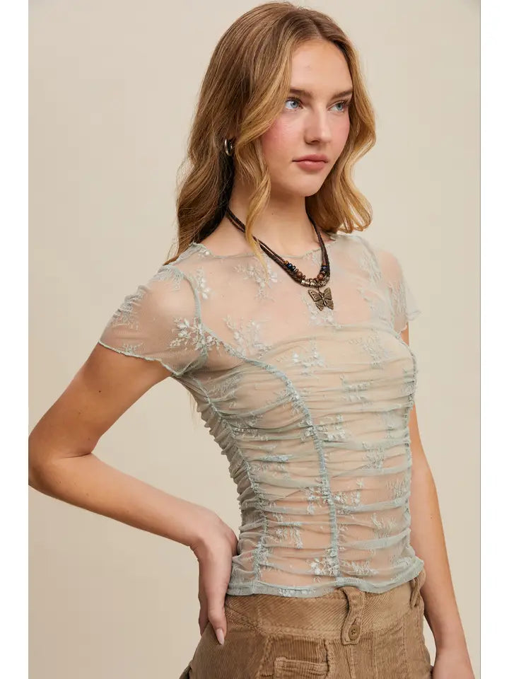 Delicate Floral Mesh: Sheer mesh fabric adorned with intricate floral embroidery for an elegant and feminine look. - Ruched Design with Stretch: Features all-over ruching with a stretchable fit for added comfort and a flattering silhouette. - Scalloped Neckline: Softly scalloped edges add a romantic and delicate finish. - Short Sleeves: Lightweight and breathable, perfect for any season. - Perfect Layering Top: Ideal for layering under blazers, cardigans, or over camis for versatile styling options. - Versatile Styling: Pair with high-waisted skirts, trousers, or jeans for a chic, modern look. - Model is 5' 9" 32-23-34.5 and wearing a size Small This top effortlessly combines romantic details with stretchable comfort, making it perfect for layering or wearing on its own for any occasion. A must-have piece for a feminine and versatile wardrobe!