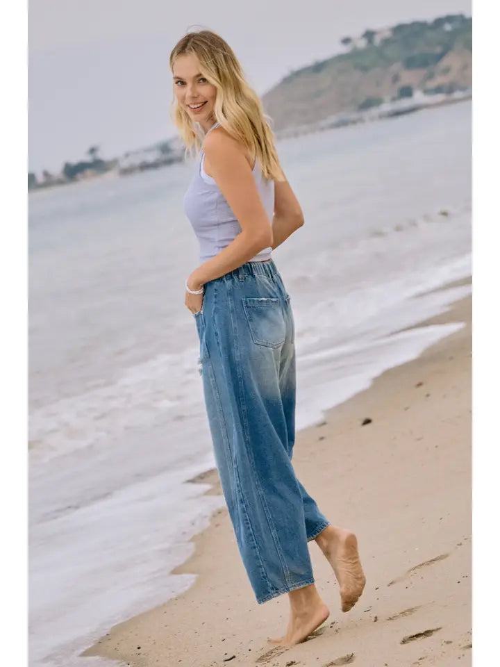 Rock these acid washed denim Barrel Pants for a playful twist on denim.
