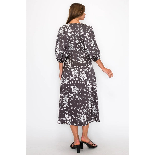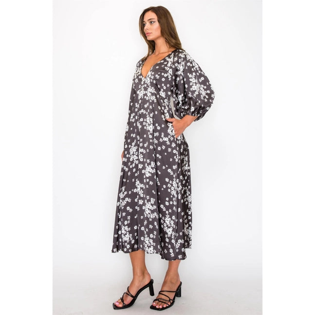 Indulge in elegance with this Satin Floral Maxi Dress. Featuring 3/4 sleeves, a sophisticated v-neck, and a beautiful floral design, this dress exudes timeless charm and feminine grace. Made of 100% polyester and designed in the USA, it's the perfect statement piece for any occasion.
