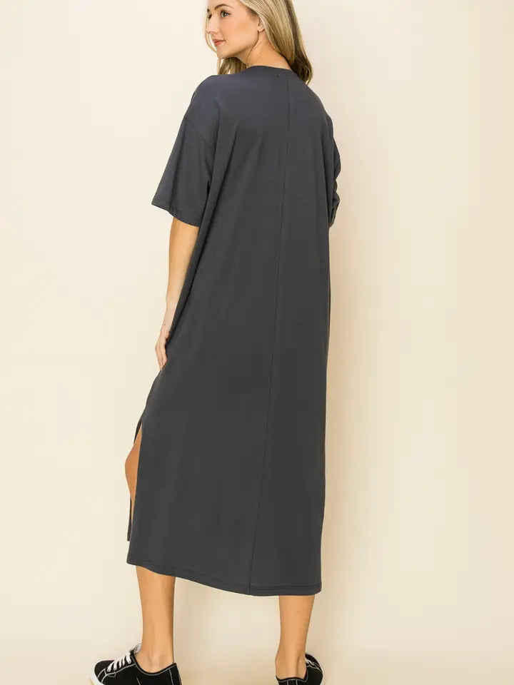 Stay effortlessly cool and comfy in the Babe Maxi Graphic Dress. Made from 100% soft cotton, this charcoal-colored dress offers breathable wear with a relaxed fit that moves with you. Its playful graphic design adds a fun, casual vibe perfect for any day out. Whether you're lounging or stepping out, this dress keeps your style fresh and easygoing.