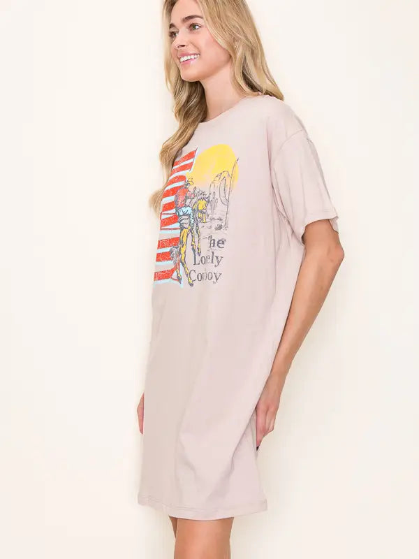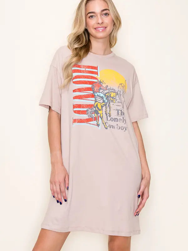 Embrace your inner cowboy with this playful Graphic Tee Dress featuring a charming "Howdy Lonely Cowboy" design. Made from 100% soft cotton in a warm latte shade, it offers all-day comfort with a relaxed fit perfect for casual outings or cozy days at home. This dress combines fun style with breathable fabric, making it a must-have for those who love a touch of western flair with a comfy twist.