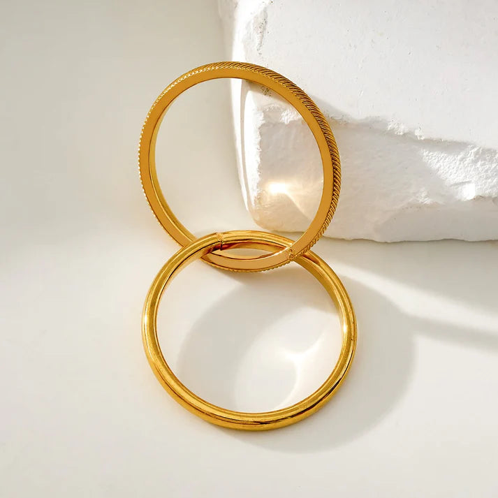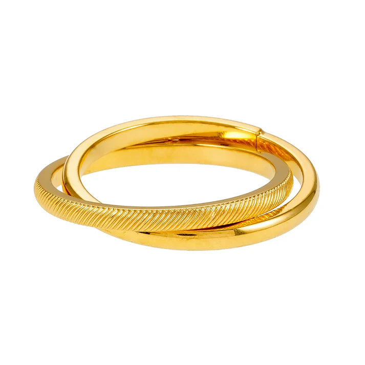 This ring is a modern twist on classic elegance. This unique piece features two distinct bands seamlessly intertwined for a striking, layered look. One band boasts a sleek, smooth finish that radiates understated sophistication, while the other showcases a beautifully textured design, adding depth and character to the ring.