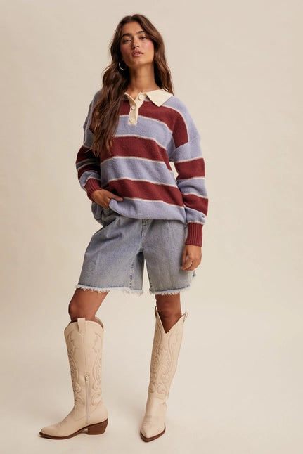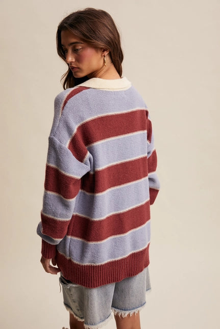 Experience cozy comfort with this soft knit sweater featuring a classic polo collar accented by contrast trim for a vintage vibe. The button-up placket with large buttons adds a playful twist, while the relaxed fit and slightly oversized silhouette make layering effortless. Wide horizontal stripes bring a fresh, spirited look, complemented by ribbed cuffs and hem for a neat finish. Perfectly versatile, it pairs easily with jeans, skirts, or casual trousers for a chic yet comfy outfit every time.