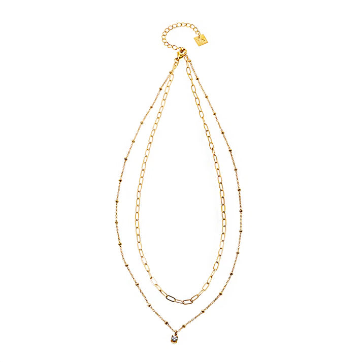 A single zirconia charm glints on a contemporary effortless layered necklace, encompassing a paper clip chain and a beaded chain. Style perfect from AM to PM.