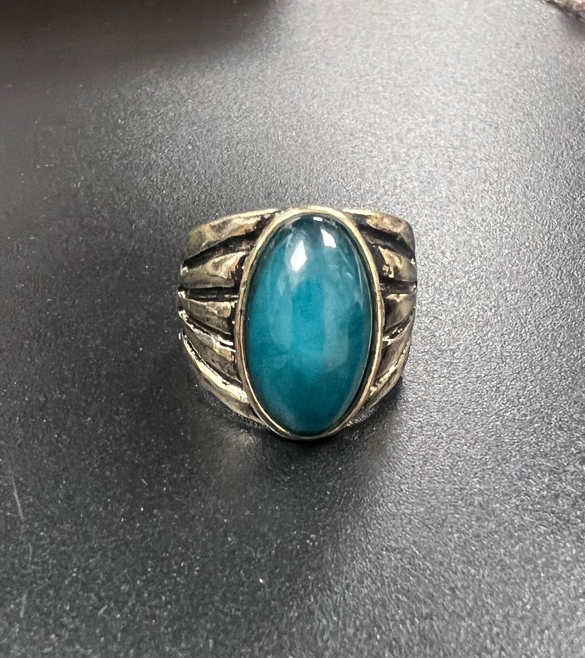 Step back in time with the Roaring Twenties Pastel Stone Gold Ring! This art deco inspired ring features a wide brushed gold band with decorative accents and a large pastel stone center.