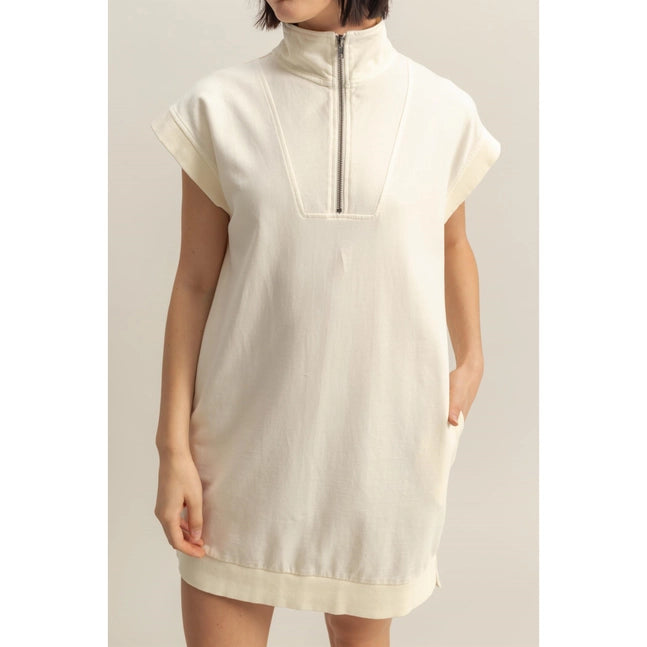 Be Ready For Some Sunshine In This Sweet Little Dress. A Mock Neckline Leads To A Half-Zipper And Short Sleeves. Plus Pockets